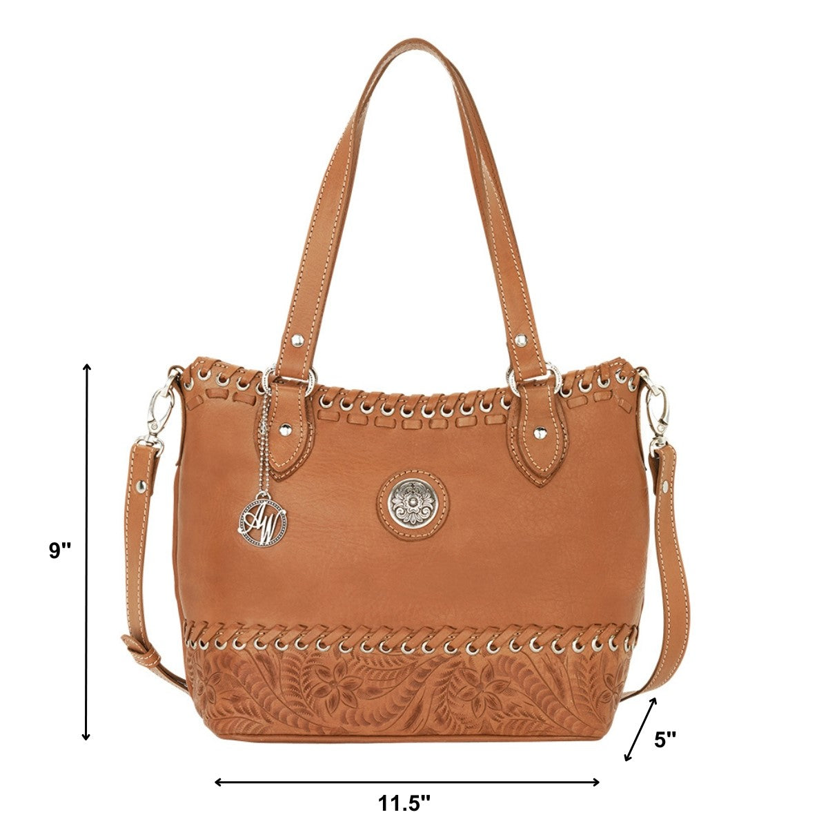 100% genuine full-grain leather Hand-stained and hand-tooled Zipper closure Back zipper pocket 100% cotton lining with 1 interior zipper pocket and 2 interior open pouches Shoulder straps 9″ drop Adjustable/removable shoulder strap 22-25″ drop Dimensions: 11.5 x 9 x 5″ Reflecting a time of free expression with its distinct handcrafted feel, the Harvest Moon collection captures a vintage familiarity. Using golden tan colors, the leather is hand-rubbed with several layers of stain to create a unique distressed feel. Accentuated with leather lacing and just enough silver hardware, this collection easily makes vintage a trend for today. Each handbag features cotton lining, an interior zip pocket, interior accessory pouches, and also includes a protective storage bag.Every American West product is hand tooled from hand dyed 100% leather cowhide. This adds to the beauty and individual variations to make your American West product truly unique.