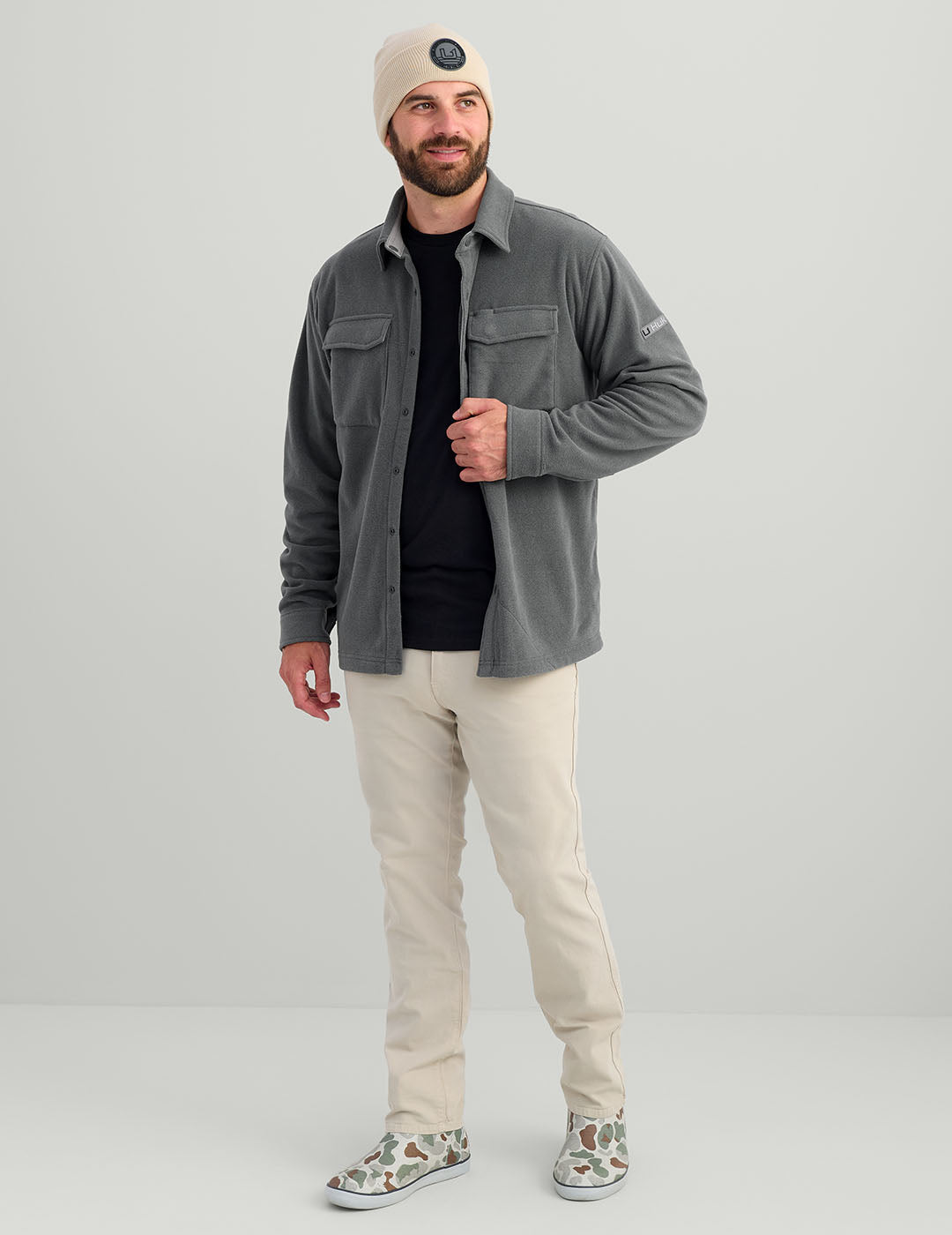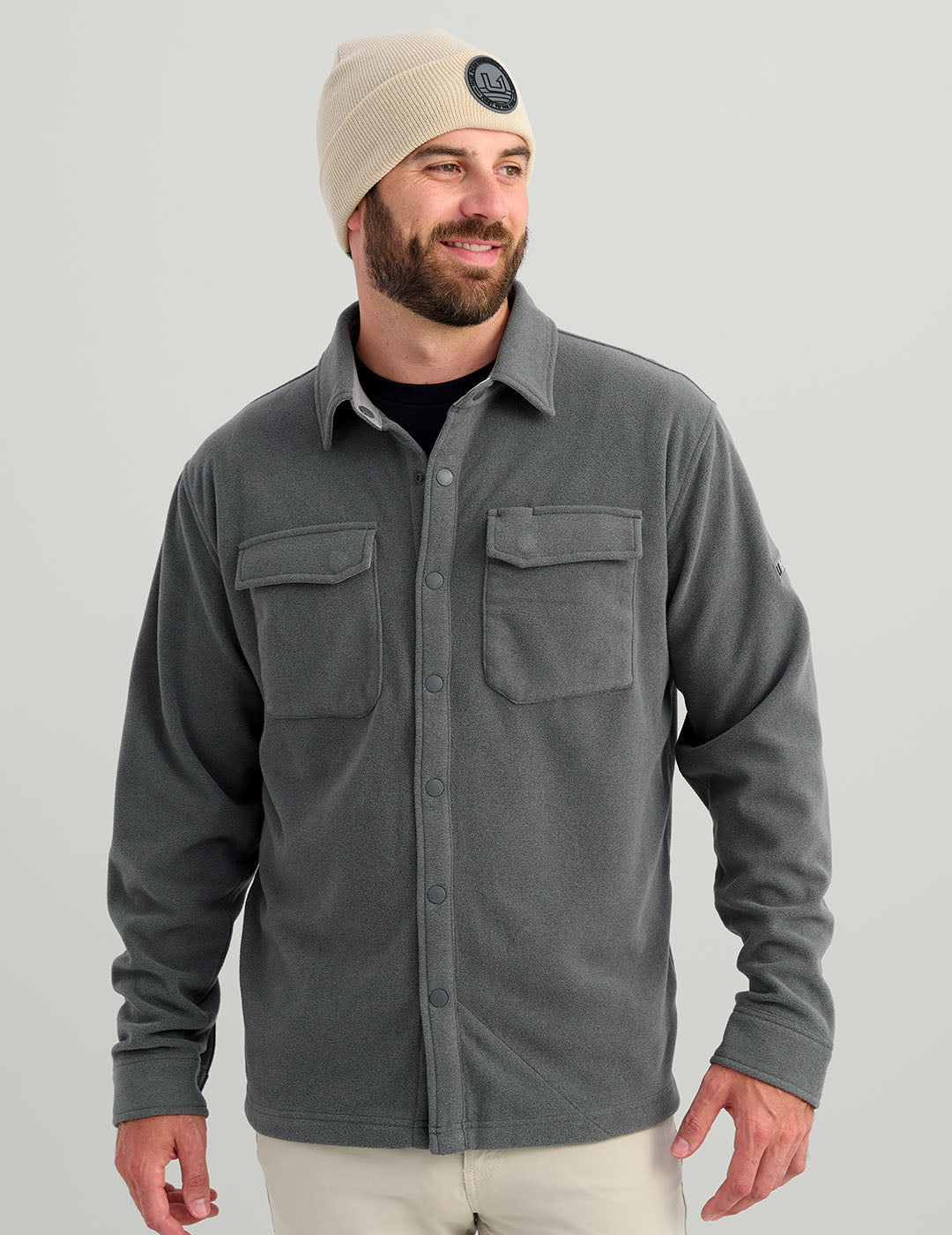Experience ultimate comfort and style with our Jetty Button-Down Shacket in Heather Volcanic Ash. Crafted from soft, lightweight fleece, this versatile shacket is ideal for cool and transitioning seasons. Whether worn solo or layered under a jacket, it offers the perfect balance of warmth and breathability. Designed with a built-in microfiber sunglasses wipe, it adds practicality for all your adventures, from boat trips to fall excursions. Elevate your wardrobe with this must-have piece. SKU: H1300114-015