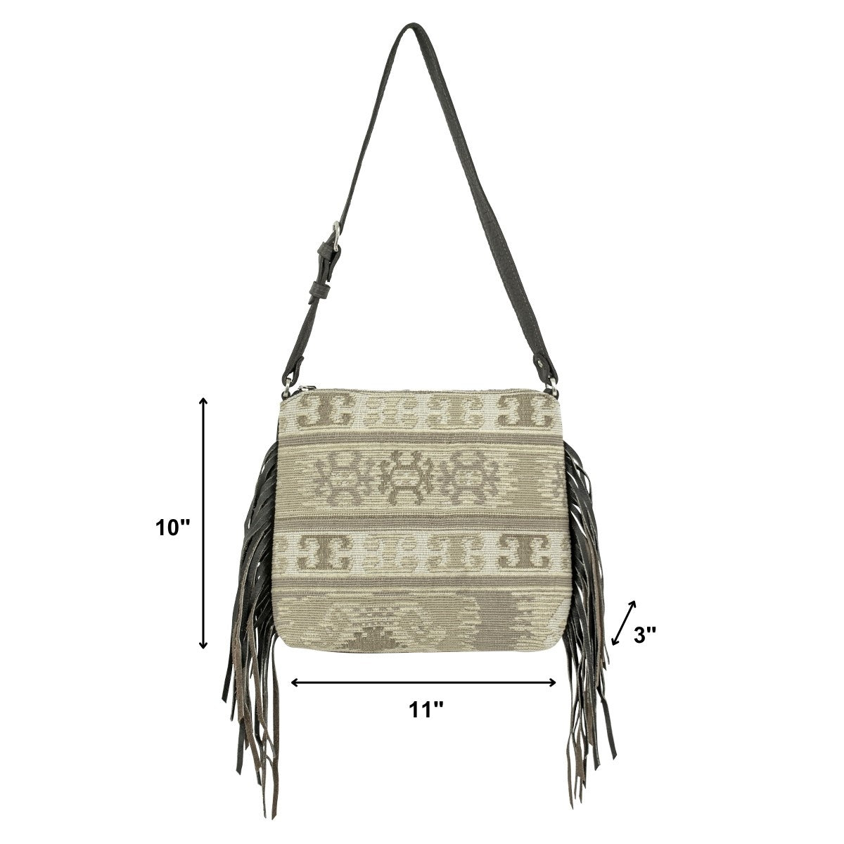Zip Top Shoulder Bag with Woven Tapestry 100% genuine full-grain leather, Woven Tapestry 100% cotton lining 1 interior zipper pocket, 2 interior open pouches Zipper closure Dimensions: 11 x 10 x 3″ Adjustable shoulder straps: 11-13.5″ drop Each handbag includes a protective storage bag Zip Top Shoulder bag with adjustable shoulder strap. Buttery soft chrome leather is accented with woven tapestry, featuring flowing leather fringe. Inside has a zipper compartment and open pouches.Every American West product is hand-tooled from hand-dyed 100% leather cowhide. This adds to the beauty and individual variations to make your American West product truly unique.